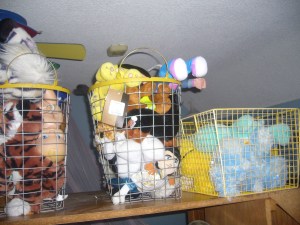 I can get some metal baskets for his stuffed animals and my friend can hang them on hooks on his wall – once that wall is cleaned off and patched!