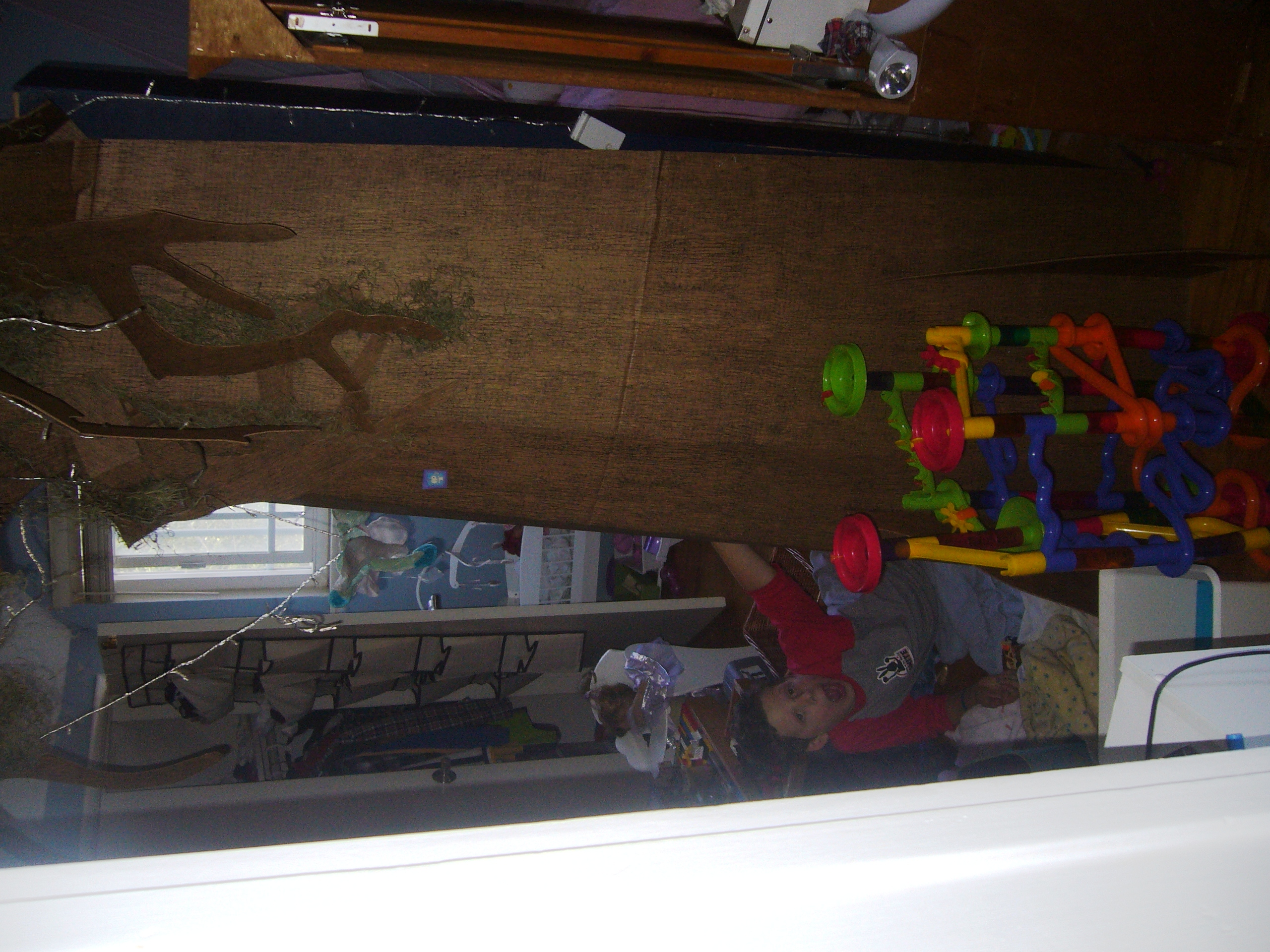 With a tree (that is missing its branches) right in the center of their bedroom. It looks like I got a cardboard cut out on sale from some Spooky Town Halloween Closeout Floor Special Sale. Oh, wait, that is where I got that tree! DUH!