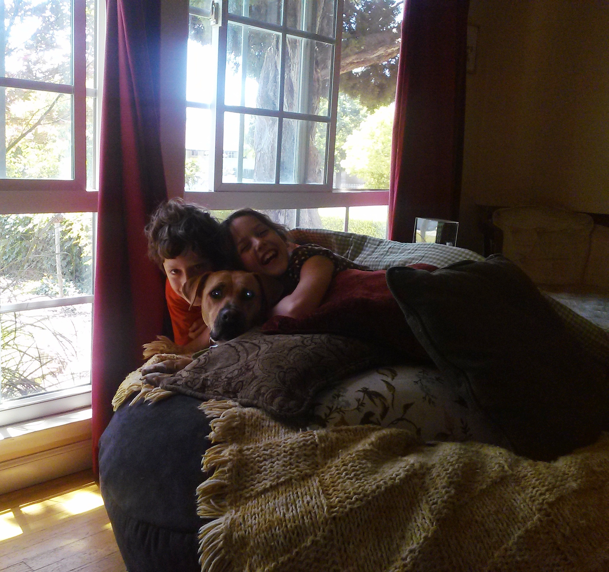 Meanwhile, I leave you with this photo of our pit bull and the kids. After much deliberation, we did end up telling our dog that Stink has T.S.. As you can see, she was very concerned.